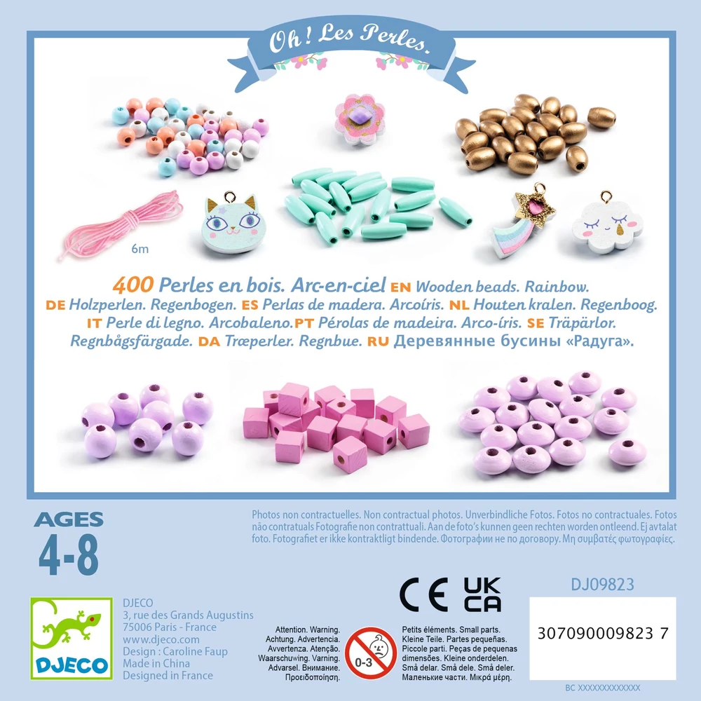 Engedd szabadjára a kicsik kreativitását a Djeco Wooden Beads Rainbow gyöngyfűző készlettel! Ebben a vidám, szivárványos, természetközeli kollekcióban több mint 400 színes fa gyöngy található — maci-, felhő- és szivárványmedálokkal –, valamint 6 méter fonal a fűzéshez. A gyerekek szabadon fűzhetnek nyakláncokat, karkötőket vagy kulcstartókat saját ízlésük szerint.