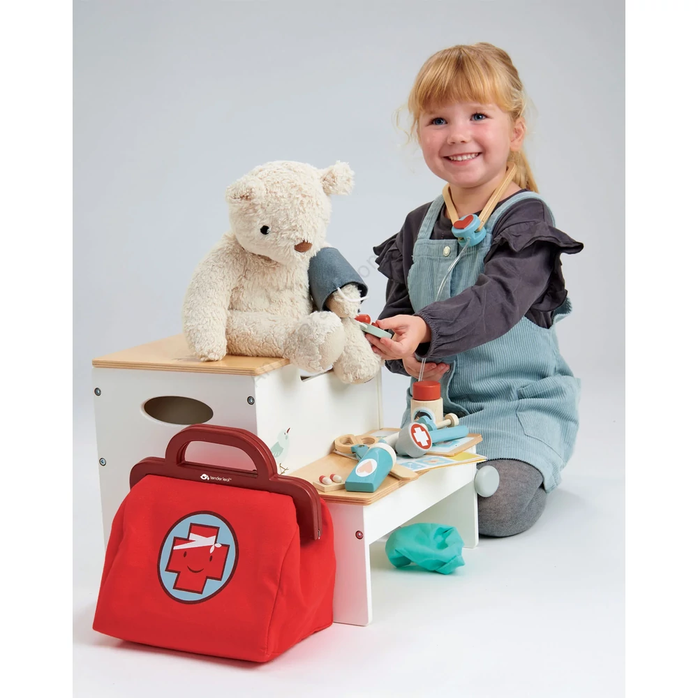 Kedvenc plüssmackó beteg lett? Itt a megoldás! A Tender Leaf orvosi táska minden kis orvos és orvosnő álma. A magas minőségű textilből készült, cipzárral zárható piros táska tele van valódi fából készült orvosi eszközökkel, amelyekkel a gyerekek játékosan segíthetnek a betegeken.